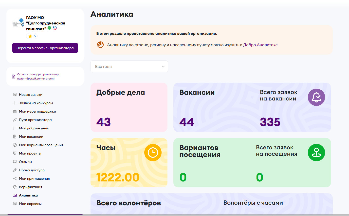 Гимназия представлена в качестве верефицированной организации на государственной платформе Добро.рф. Каждый ученик может стать добровольцем, завести электронную волонтерскую книжку и получать волонтерские часы.