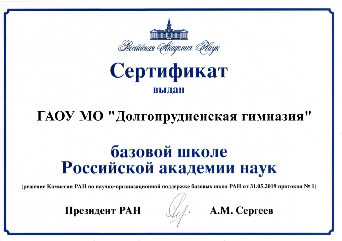 Долгопрудненская гимназия вошла в состав Базовых школ РАН с 2019 года со старта проекта. В Долгопрудненской гимназии реализуется проект по модели профильной школы.